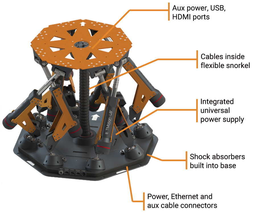 TMotion 6DOF is design to fit seamlessly into your simulator application. Reconfigurable and plug-and-play for flight, driving, maritime and other simulator applications.